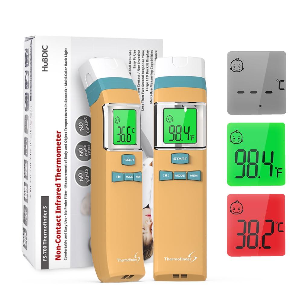 - Non-Contact, Accurate Thermometer The HubiBaby non-contact forehead infrared thermometer is for accurate, safe and fast temperature measurement. It is produced to measure accurate temperature through strict quality control. It can measure temperature from 0 to 2 inches away and does not require direct contact with the body. In the case of the Thermofinder S FS-700 models, the curved ergonomic design makes them suitable for use with one hand, and is small and light, making it easy to carry.