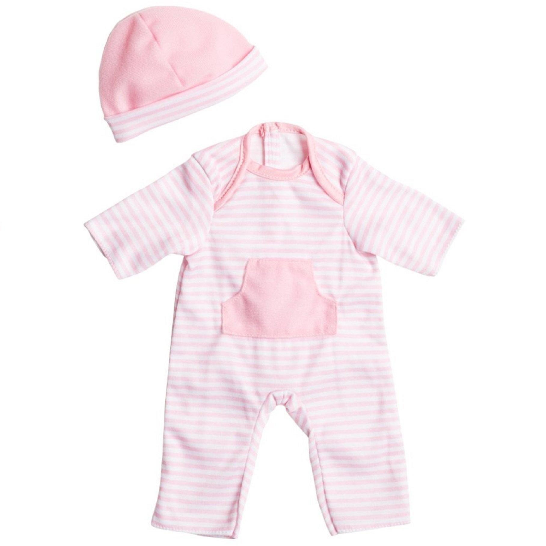 Dressed and ready to play! Our Striped Light Pink Romper is perfect for most dolls 9" to 11". Quality outfits are machine washable and made to last thru all those diaper changes! Rompers are available in 4 fashionable colors for you to choose from so you can have the best dressed baby doll in the playground. Clothes securely fasten in the back with hook and loop, perfect for little fingers. Sweet little pocket details and matching hat make this outfit extra cute. JC Toys rompers are safe for all dolly mommies and daddies 2+. JC Toys meets and exceeds all Toy Safety Requirements.