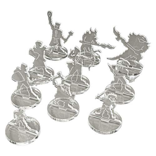 Compatible with your favorite fantasy role-playing games. These markers are transparent characters representing all the iconic races and classes of fantasy RPGs. This set includes character markers for Human Fighter, Dwarf, Halfling, Elf Archer, Rogue, Gnome, Cleric, Wizard, Demon-kin, and Dragon-kin. Laser-cut from clear acrylic.