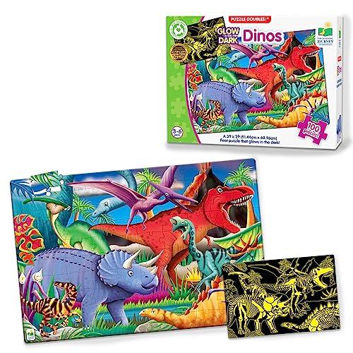 Learning about dinosaurs has never been so much fun. Expand your knowledge of dinosaurs with this 100-piece Puzzle Double. After you put the puzzle together, turn off the lights and the puzzle glows in the dark. Additionally turn the puzzle over and you have a coloring activity. The bright illustrations encourage parent-child conversation. Each 100-piece puzzle measures a giant 3' X 2'. Ages 3+ years.